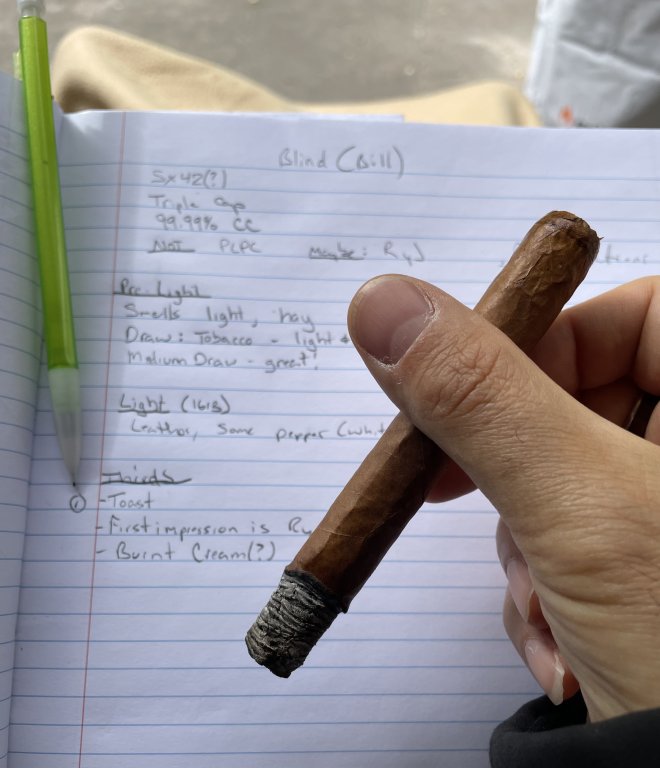 Last third: having a few relights, like this thing was a witch on the stake with great lung capacity. Close to full at this point. Surprisingly, the cream is still holding out. Good tobacco flavor coming through. Smoke still pouring out. Ima take a guess at NC liga series with the strength coming through.