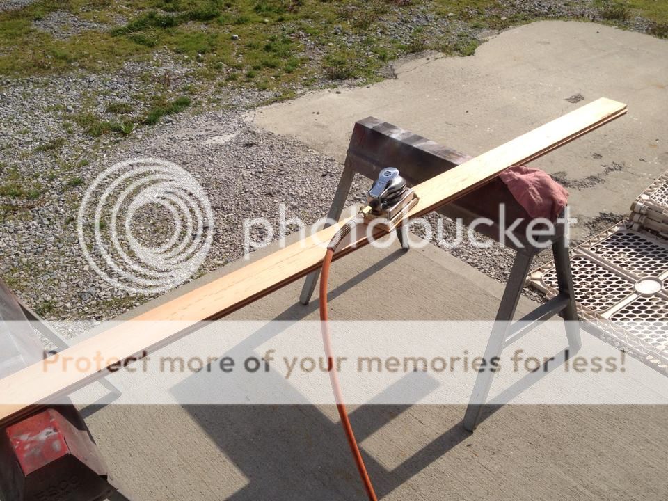 #5 Inside front being sanded, as it will receive four coats of Polly to seal the wood. This will be the only interior wall that will not be sealed with insulation and Spanish Cedar.