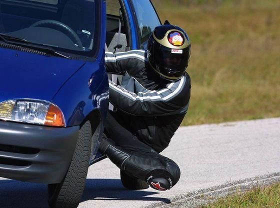 I started taking corners faster and faster, and was having a blast. Until I took a corner at top speed (38mph.. maybe?) and hit a patch of wet, matted down leaves, that immediately dumped me and sent me skidding into the curb, which then flipped me and the Spree in the air together, and into a row of hedges and the house immediately behind them.