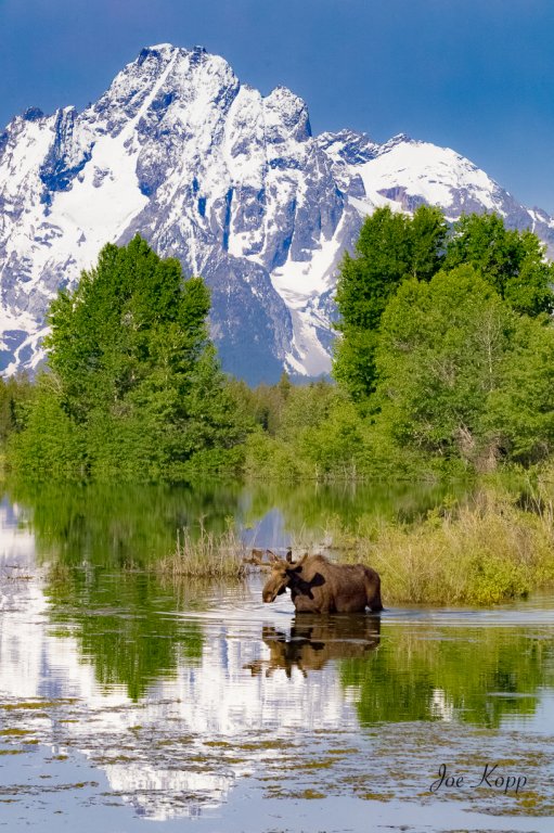 I was lucky enough to go to the Grand Teton National Park several times over the last 15 years or so. What a beautiful park with mountains, lakes, rivers, and wildlife. Here is an image from June 2014 at Pilgrim Creek looking toward Mt. Moran with a rather large moose posing/modeling for some photographs.