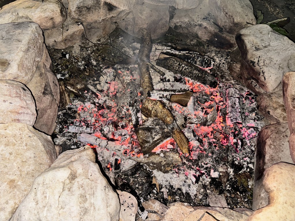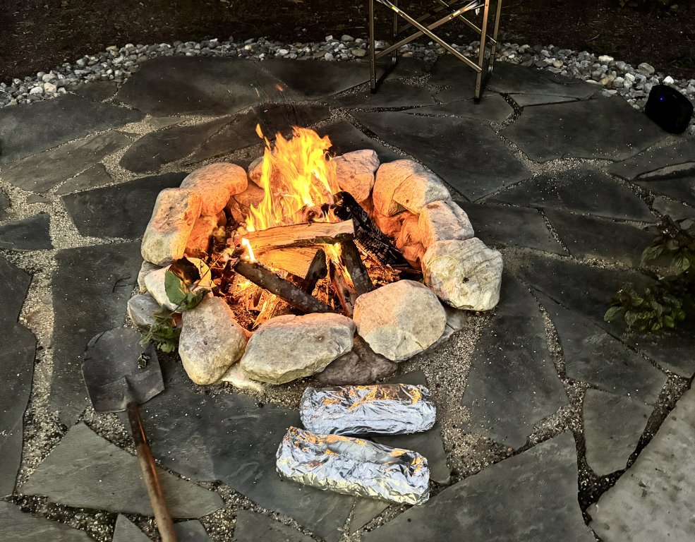 Once you have a good bed, and some still burning wood, clear an opening in the middle and place the packet(s) on top or coals. Then using a shovel, place coals and wood on top. Sometimes I need to have some seasoned dead tree branches or small bows handy to touch the top portion up if I start seeing a lot of exposed foil. You shouldn't ever have to touch the bottom up. Be careful not to be too rough and puncture a packet. If the EVOO leaks out, the food will burn and not be edible.