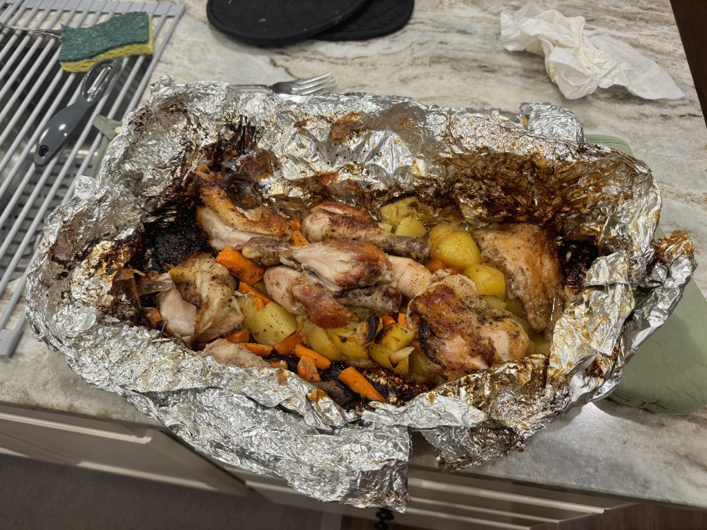 Open up slowly, using a fork to gently separate the chicken skin from the foil if it sticks.