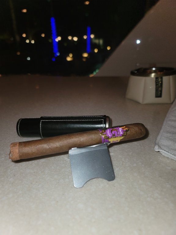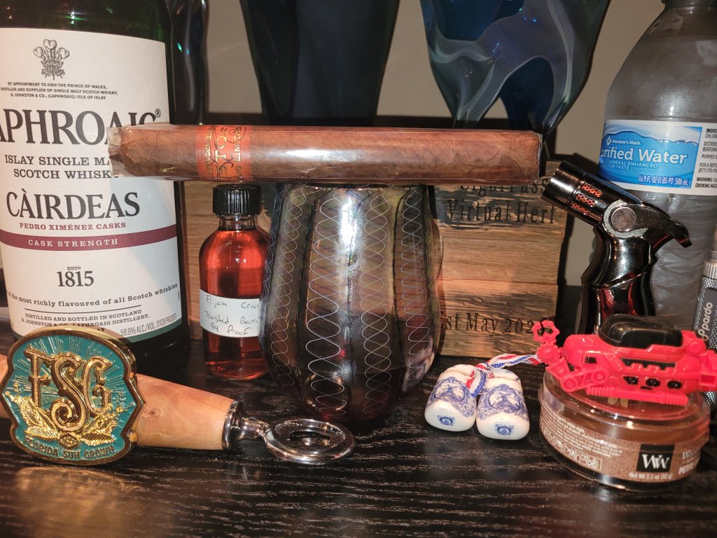 The first box of cigars I bought were Kristoff Curojo Limitada. Drinking a delicious Laphroaig Cairdeas PX. The knick knacks are from Saturday Vherf brothers. Seven that you can see. I hate to say it but the draw was way too loose and it was a pain to keep lit. Good notes but a pain in the ass.View attachment 54516