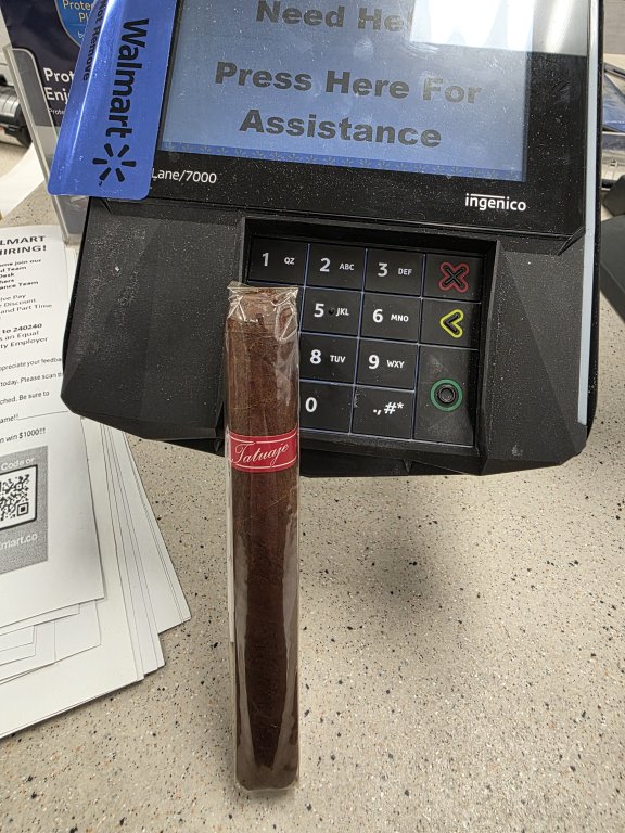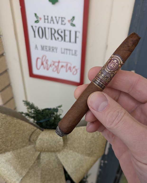 Jas Sum Kral Red Knight figurado from the sticker pass. The blend really shines in this vitola! It's a narrow perfecto, about 5" long and going from maybe a 42 or 44 ring at the most to probably 38 before the sharp taper at the head.