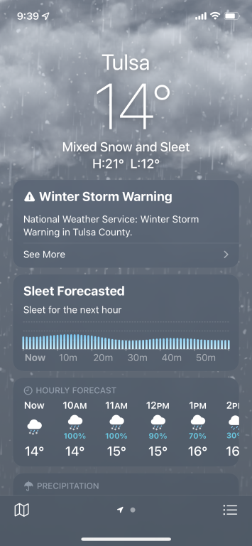 Sleeting and snowing today, more snow tomorrow. Supposed to be driving back to OKC tomorrow night, for a Friday surgery. My wife will be driving and she’s not the best driver to begin with, so we’ll see.