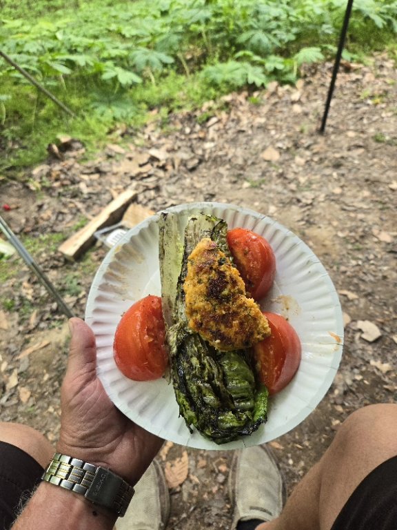 I had forgotten about those romaine hearts cooked on the grill with balsamic vinegar. I need to have those soon!Salmon burger Mediterranean style fried in cast iron on an open fire. Tomato wedges fried in the same cast iron.