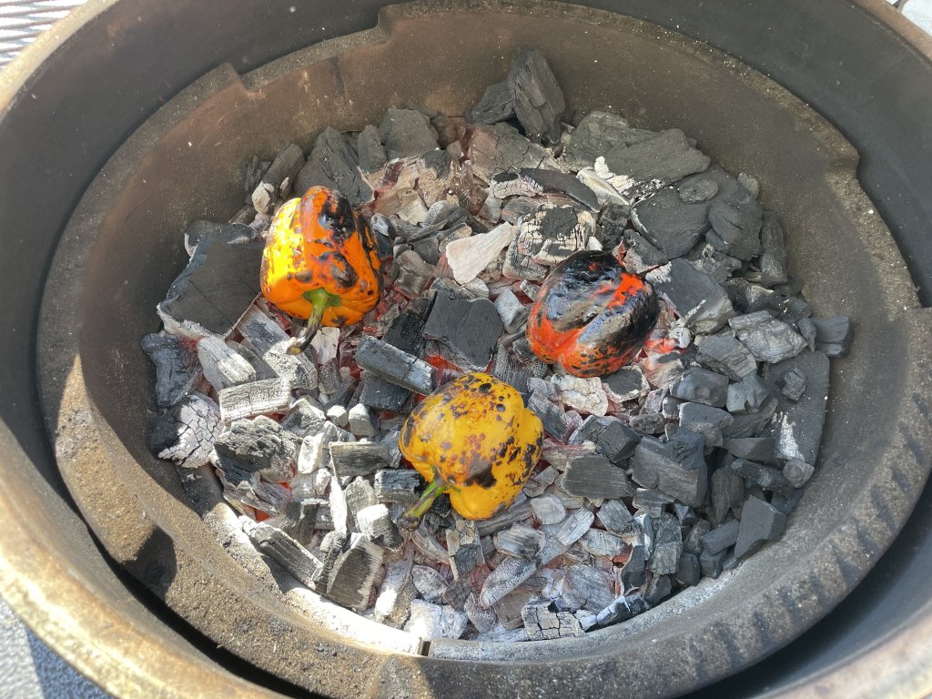 Oh yeah! Save The Good shit for when you go back home!Summer vegetable sauté - Zucchini, red, yellow, and golden bell peppers with fresh morel mushrooms. Had fresh garlic, shallots, EVOO, and balsamic vinegar. I cooked/seared the peppers directly on the hot coals and removed the skins after they had cooled.