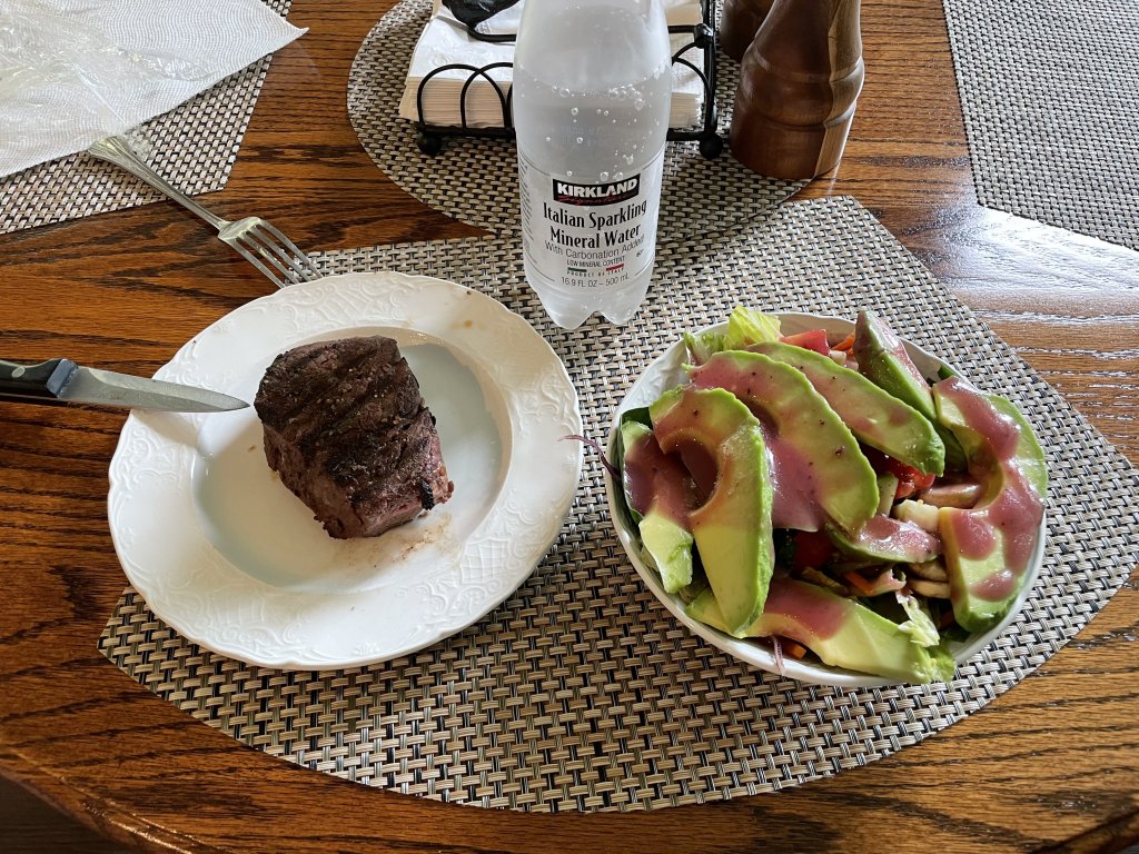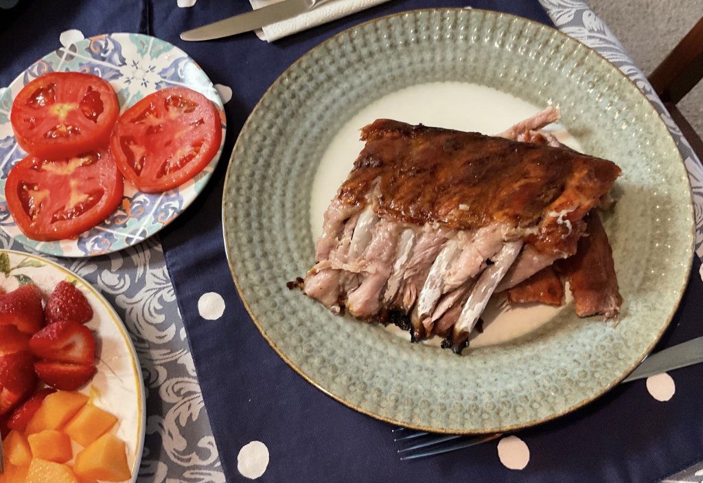 looks delicious!!Baby backs, cooked outside. Made a tent for three hours then opened up for the grand finale. No special rub, just S&P and yellow mustard. Yes, they fell off da bone. Me sitting outside at 92° cooked my ole ass too but it was worth it. Homemade potato salad, squash, tomatoes, three different fruits made for a hearty meal.