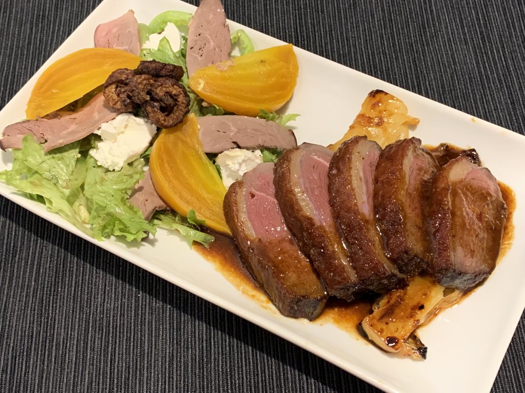 Now there's a medium rare duck I can get behindDuck two ways: smoked duck salad with roasted golden beets, goat cheese and duck cracklings; and sautéed duck with orange braised endive and a veal stock demi glace. The plate was too small, but maybe Mrs. Nihon will fix that...